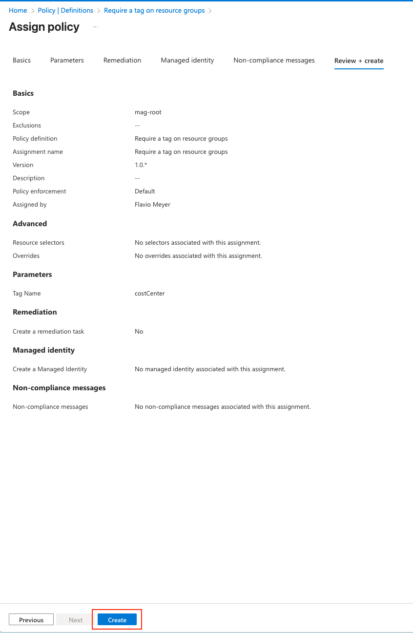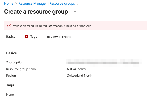 After allowing a few minutes for the assignment to propagate, test the policy by attempting to create a resource group without the required costCenter tag. During the Review + create step the portal performs validation and will display a failure message.