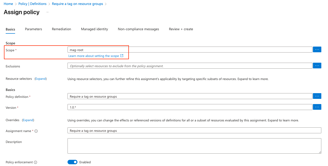 6. Set the Scope (management group, subscription, or resource group). For testing, use a dev subscription or a test resource group.