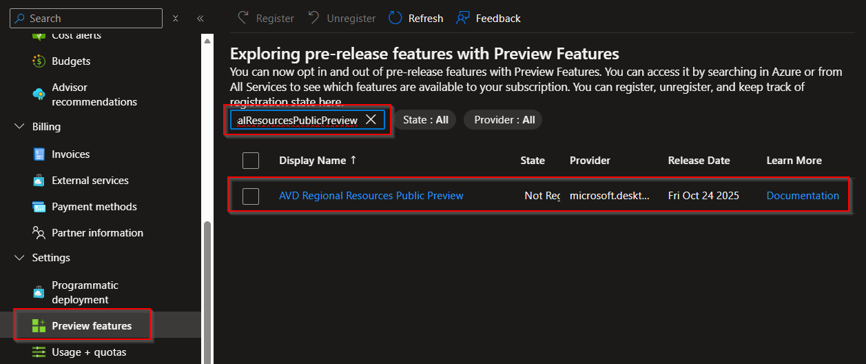 - Filter for AVDRegionalResourcesPublicPreview, select it and click Register.
