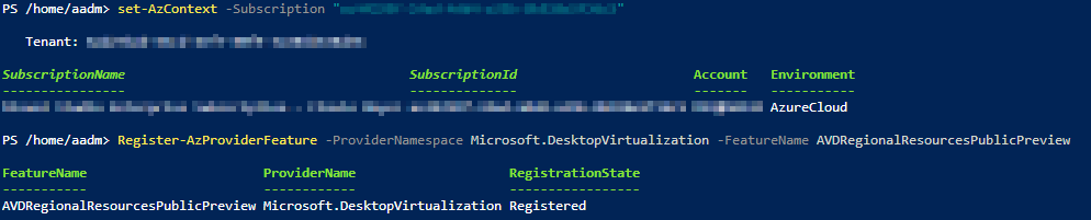 - Run: Register-AzProviderFeature -ProviderNamespace Microsoft.DesktopVirtualization -FeatureName AVDRegionalResourcesPublicPreview