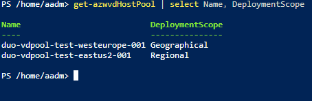 New-AzWvdHostPool -ResourceGroupName duo-rg-avd-test-switzerlandnorth-001 -Name duo-vdpool-test-eastus2-001 -Location 'eastus2' -DeploymentScope 'Regional' -HostPoolType 'Pooled' -PreferredAppGroupType 'Desktop' -LoadBalancerType 'DepthFirst' -ValidationEnvironment:$false