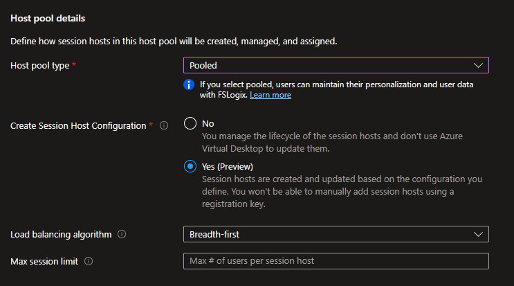 Go to the Azure portal and create a pooled host pool. Configure it with a session host configuration. Ephemeral OS disks only work on pooled host pools with a session host configuration.