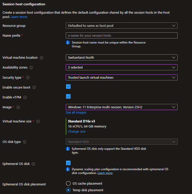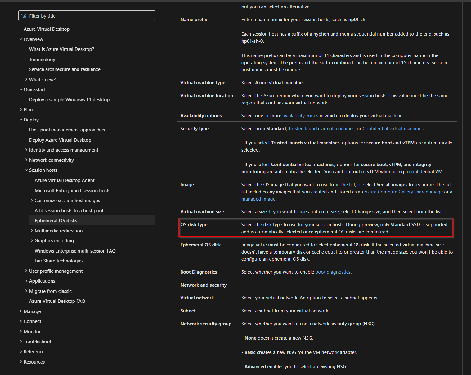 On the Session hosts tab, choose the VM size, image, and OS disk type. When you enable ephemeral, the portal auto‑selects the required OS disk type. Microsoft Learn currently lists only Standard SSD in preview as suitable, but in my tests the portal selected Standard HDD and even indicated only HDD was supported. 😀
