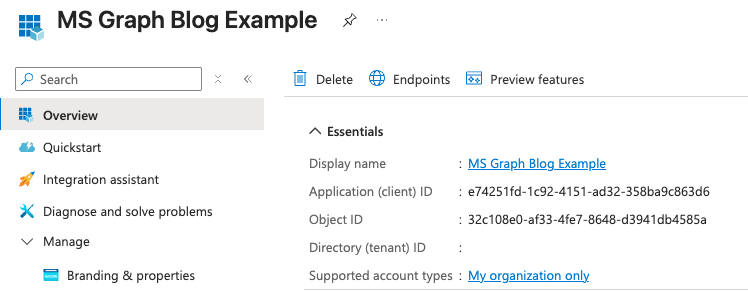 using'./main.bicep' // Parameters param uniqueName = 'MSGraphBlogExample' param displayName = 'MS Graph Blog Example' param permissionIdentifier = '5b567255-7703-4780-807c-7be8301ae99b' param type = 'Role' param graphAppId = '00000003-0000-0000-c000-000000000000'// Microsoft Graph param delegatedScope = ''