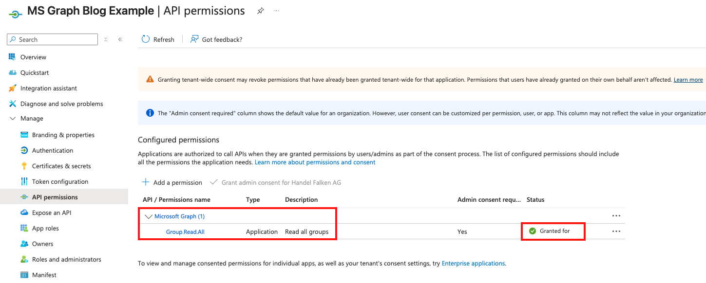 After executing the Bicep code, an app registration named MS Graph Blog Example is created. In addition, the API permission Group.Read.Allis added as an application permission, which has been granted directly.
