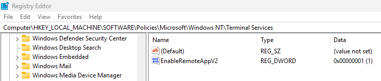- If it displays another value, confirm hosts/clients meet prerequisites and that the EnableRemoteAppV2 registry value is present.