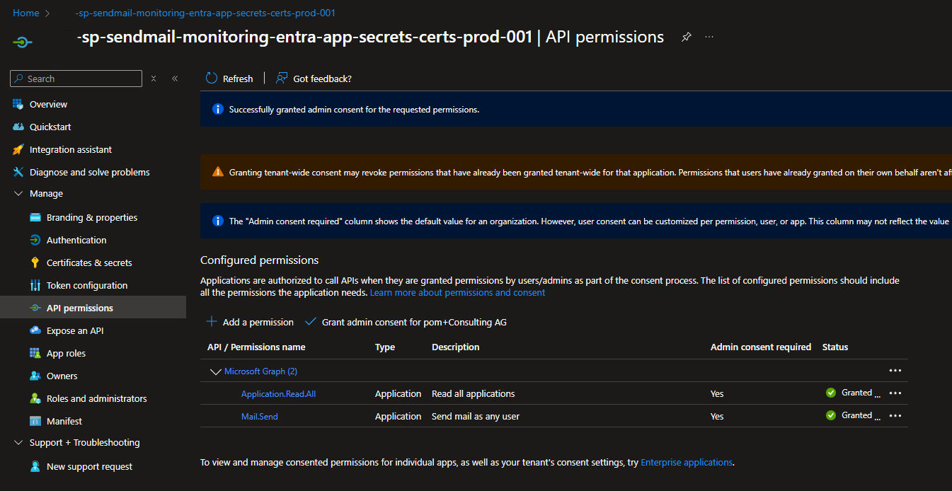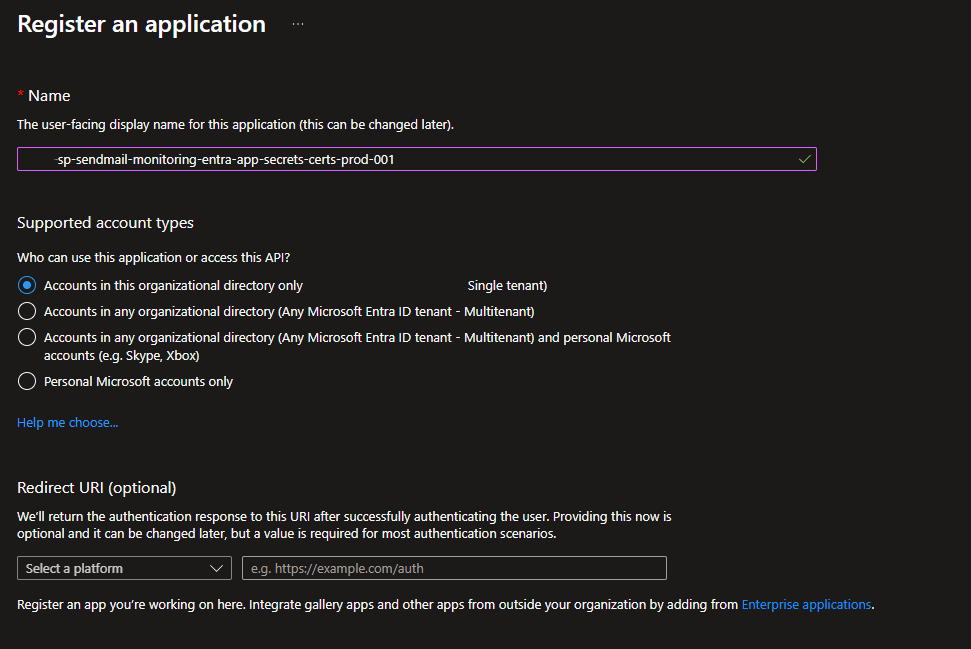 To begin with your “Entra ID app monitoring solution”, create a dedicated app registration that your runbooks will use to call Microsoft Graph, read enterprise applications and app registrations, and send notification emails. Perform these steps using the Azure Portal or the Entra ID portal: