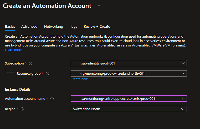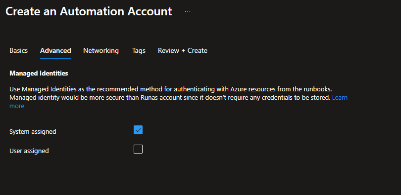 - Enable the System-assigned Managed Identity when creating the Automation Account, as it is a required step during the initial setup process. However, in this use case with a service principal, the managed identity is not necessary and can be disabled afterward if not actively used.