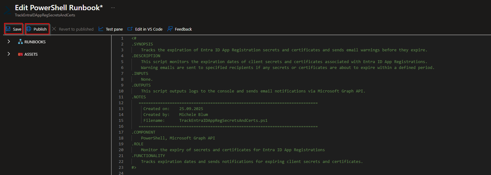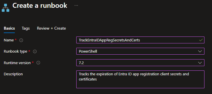 - The first runbook will scan App Registrations for client secrets and certificate expirations.