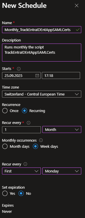 Although SAML certificate expirations can be monitored out-of-the-box in Entra ID, I preferred to consolidate everything into one solution that covers app registration secrets and certificates as well as SAML certificates for enterprise applications. Centralizing the checks in a single Automation Account simplifies alerting, logging, and escalation, reduces the risk of surprises, and gives my customers one reliable place to manage Entra ID credential lifecycles.
